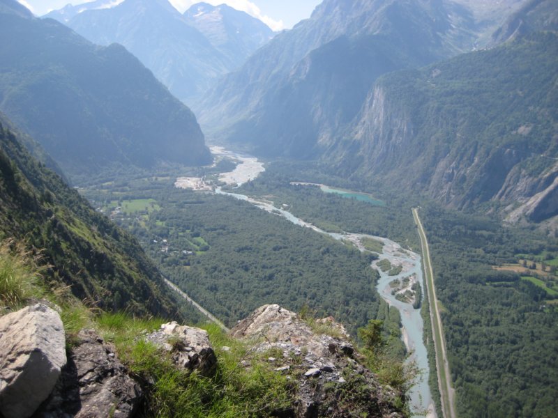 This gives you an idea of how sheer the drop off is from the road. This is looking almost directly down on the Romanche river and the D 1091 highway to Borg d'Oisans. We must have been about 1000 feet or so above the valley floor. One big step.